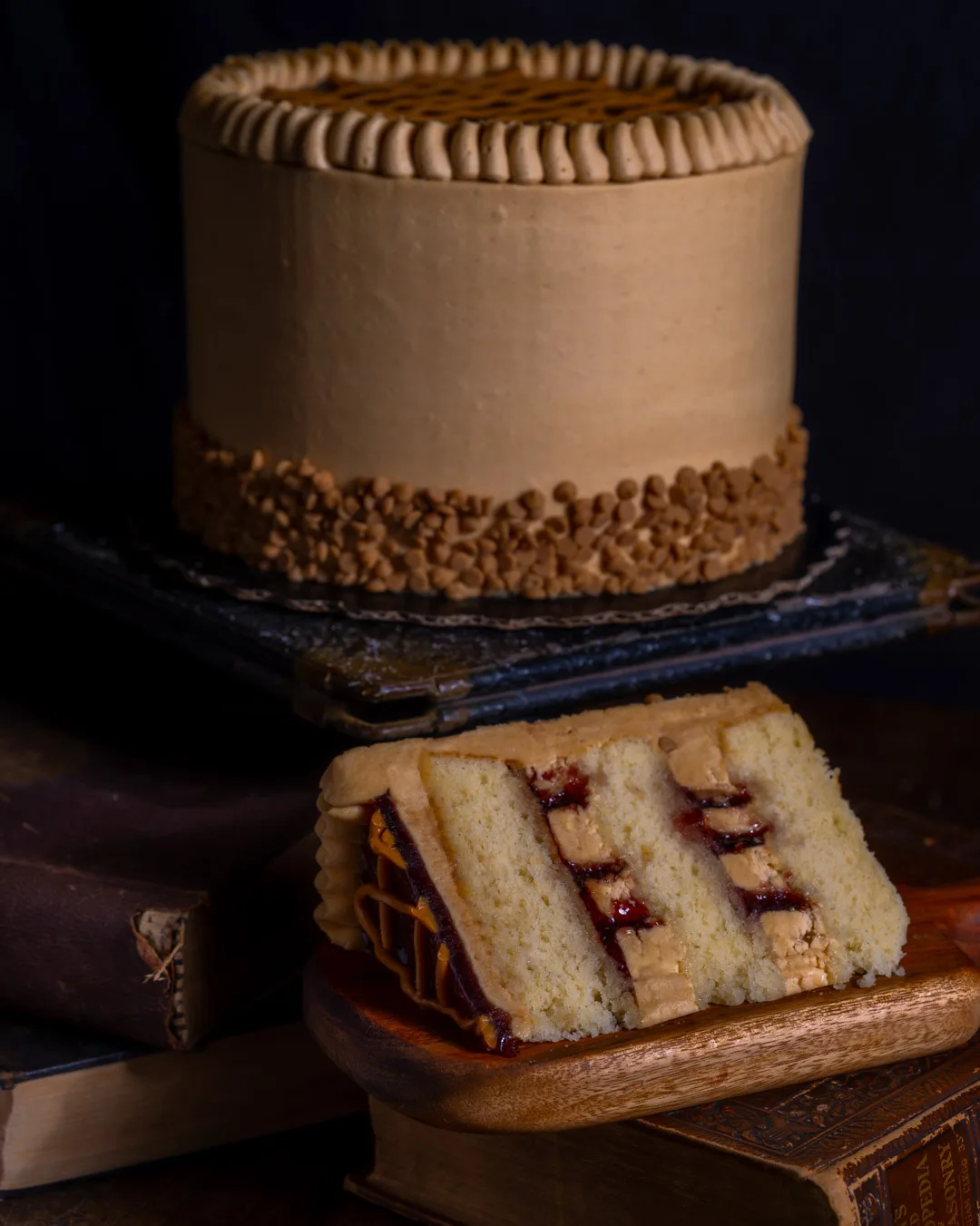 A Limited Edition Cake so popular we had to keep it around! The Peanut Butter & Jelly Cake is the real deal! This one is perfection in its simplicity. Start with three layers of our delicate Vanilla Cake as the bread. Smother that cake in our Peanut Butter Buttercream (one of my biggest addictions) and fill that PB with channels of real Grape Jelly! This is your childhood rolled into one heavy Gideon’s Cake.